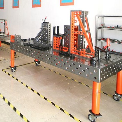焊接工作臺是一種多用途焊接工裝平臺工藝裝備集焊接,裝配,檢驗為一體.具有三維柔性組合焊接工裝夾具同樣的互換性,通用性,經(jīng)濟性等優(yōu)點;與普通平板焊臺對比可以提高工作效率,節(jié)省原材料,節(jié)省資金;使用過程中可選擇多樣式的三維組合標準夾具配件進行夾緊定位加工作業(yè),操作簡單、使用方便。為產(chǎn)品快速上市贏得競爭機遇.默認為D28系列,孔徑D28mm,孔距100mm;表面平面度高達0.05/1000mm,硬度可達38-45HRC,可做作為焊接過程中產(chǎn)品檢驗平臺使用。同時它具有定位準確,拆卸方便,互換性高等特點,為焊接行業(yè)提供了一種標準化的柔性焊接工藝裝備,改變焊接車間傳統(tǒng)的落后面貌,是焊工的好幫手,是焊接車間的環(huán)寶的象征,為公司7S工作提供強有力保證。同時也為機器人代替人工打好了堅實的基礎。